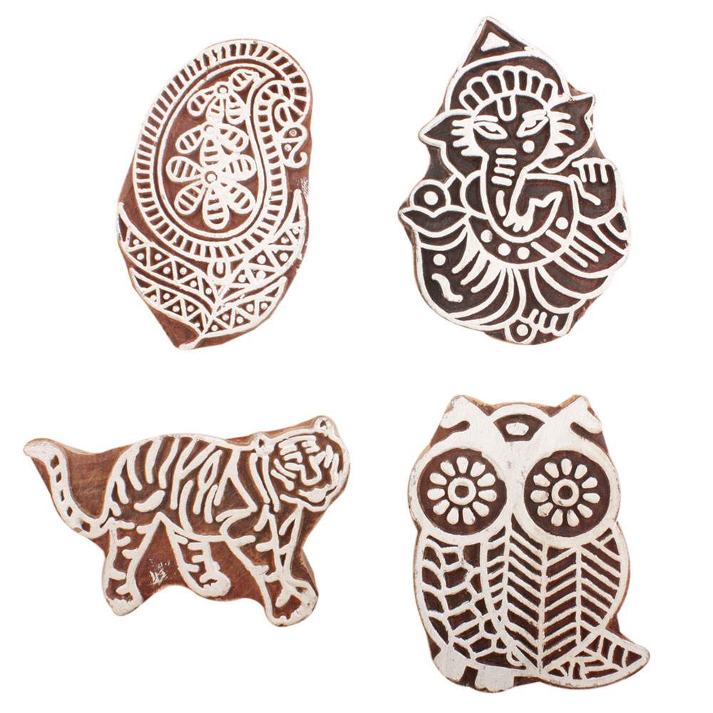 Set of 4 Piece New Mix Wooden Printing Block. Ideal for use on Fabric, Paper, Canvas, etc. These Blocks can be use to Print with Oil Colors, Fabric Colors, Water Colors, Acrylic Colors and Vegetable Colors.