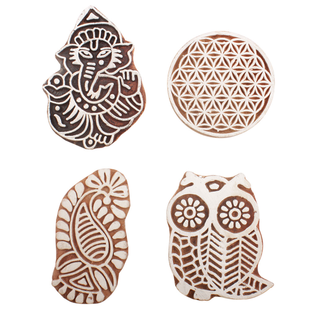 Set of 4 Piece New Mix Wooden Printing Block. Ideal for use on Fabric, Paper, Canvas, etc. These Blocks can be use to Print with Oil Colors, Fabric Colors, Water Colors, Acrylic Colors and Vegetable Colors.