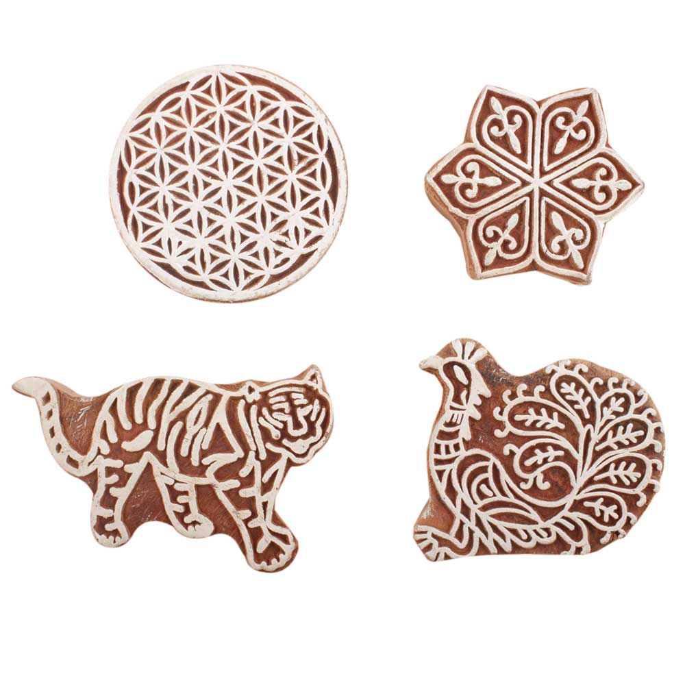 Set of 4 Piece New Mix Wooden Printing Block. Ideal for use on Fabric, Paper, Canvas, etc. These Blocks can be use to Print with Oil Colors, Fabric Colors, Water Colors, Acrylic Colors and Vegetable Colors.