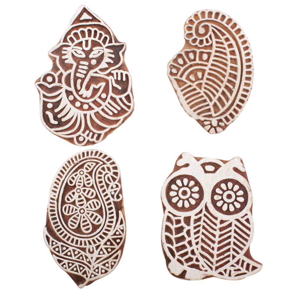 Set of 4 Piece New Mix Wooden Printing Block. Ideal for use on Fabric, Paper, Canvas, etc. These Blocks can be use to Print with Oil Colors, Fabric Colors, Water Colors, Acrylic Colors and Vegetable Colors.
