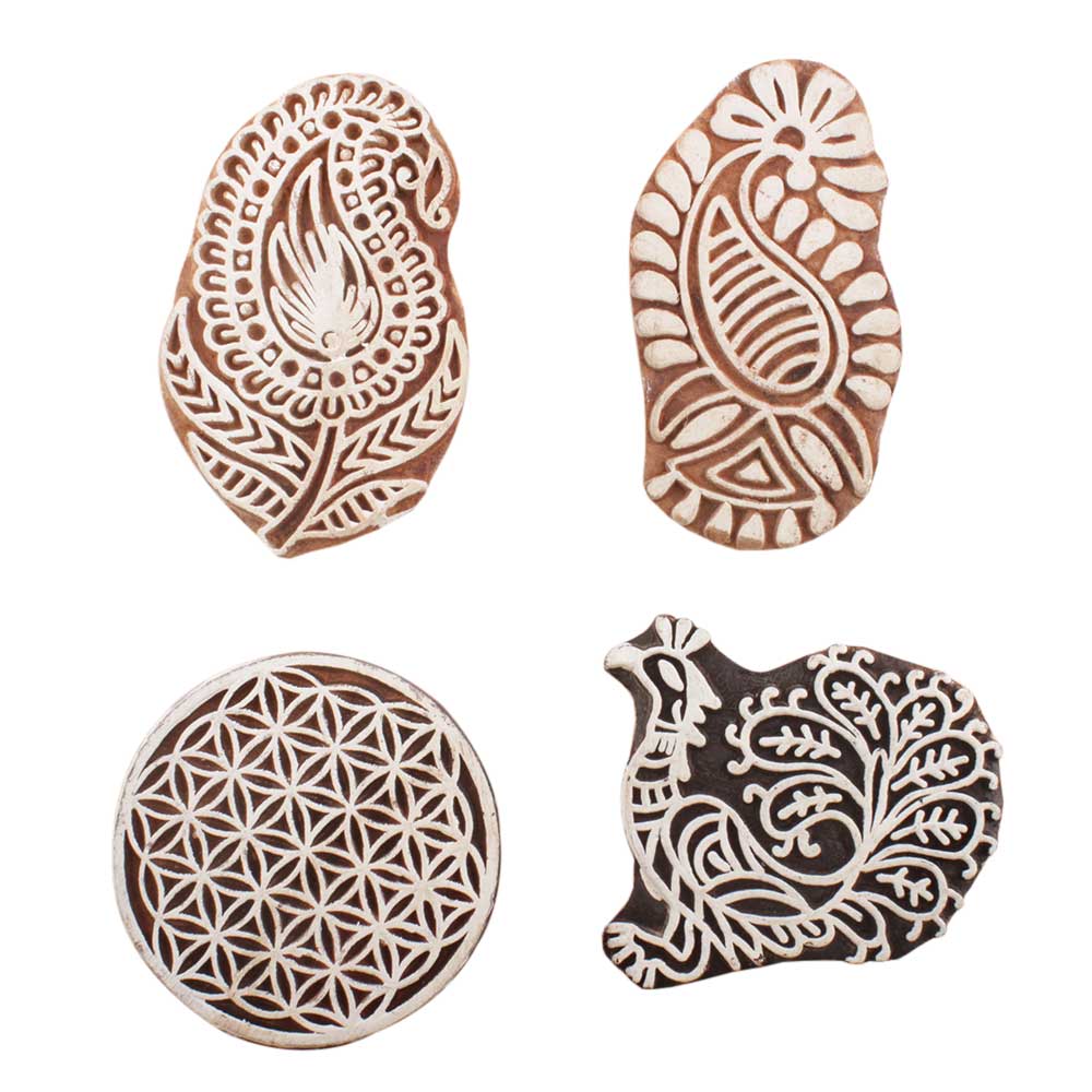 Set of 4 Piece New Mix Wooden Printing Block. Ideal for use on Fabric, Paper, Canvas, etc. These Blocks can be use to Print with Oil Colors, Fabric Colors, Water Colors, Acrylic Colors and Vegetable Colors.