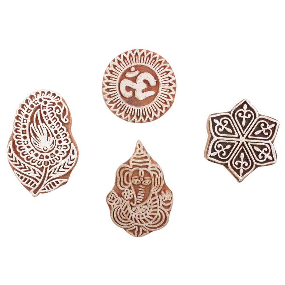 Set of 4 Piece New Mix Wooden Printing Block. Ideal for use on Fabric, Paper, Canvas, etc. These Blocks can be use to Print with Oil Colors, Fabric Colors, Water Colors, Acrylic Colors and Vegetable Colors.