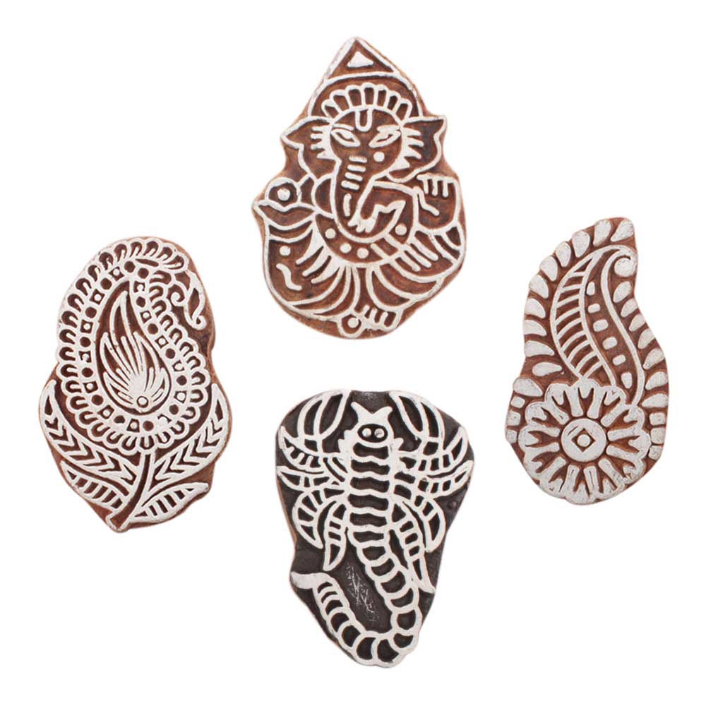 Set of 4 Piece New Mix Wooden Printing Block. Ideal for use on Fabric, Paper, Canvas, etc. These Blocks can be use to Print with Oil Colors, Fabric Colors, Water Colors, Acrylic Colors and Vegetable Colors.