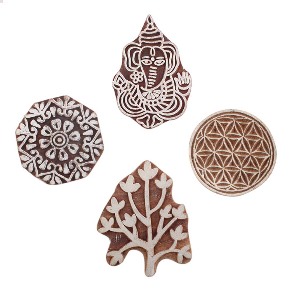 Set of 4 Piece New Mix Wooden Printing Block. Ideal for use on Fabric, Paper, Canvas, etc. These Blocks can be use to Print with Oil Colors, Fabric Colors, Water Colors, Acrylic Colors and Vegetable Colors.
