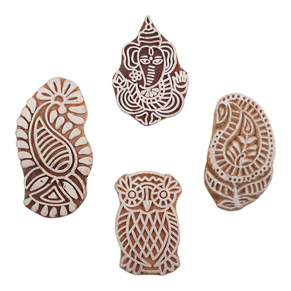Set of 4 Piece New Mix Wooden Printing Block. Ideal for use on Fabric, Paper, Canvas, etc. These Blocks can be use to Print with Oil Colors, Fabric Colors, Water Colors, Acrylic Colors and Vegetable Colors.