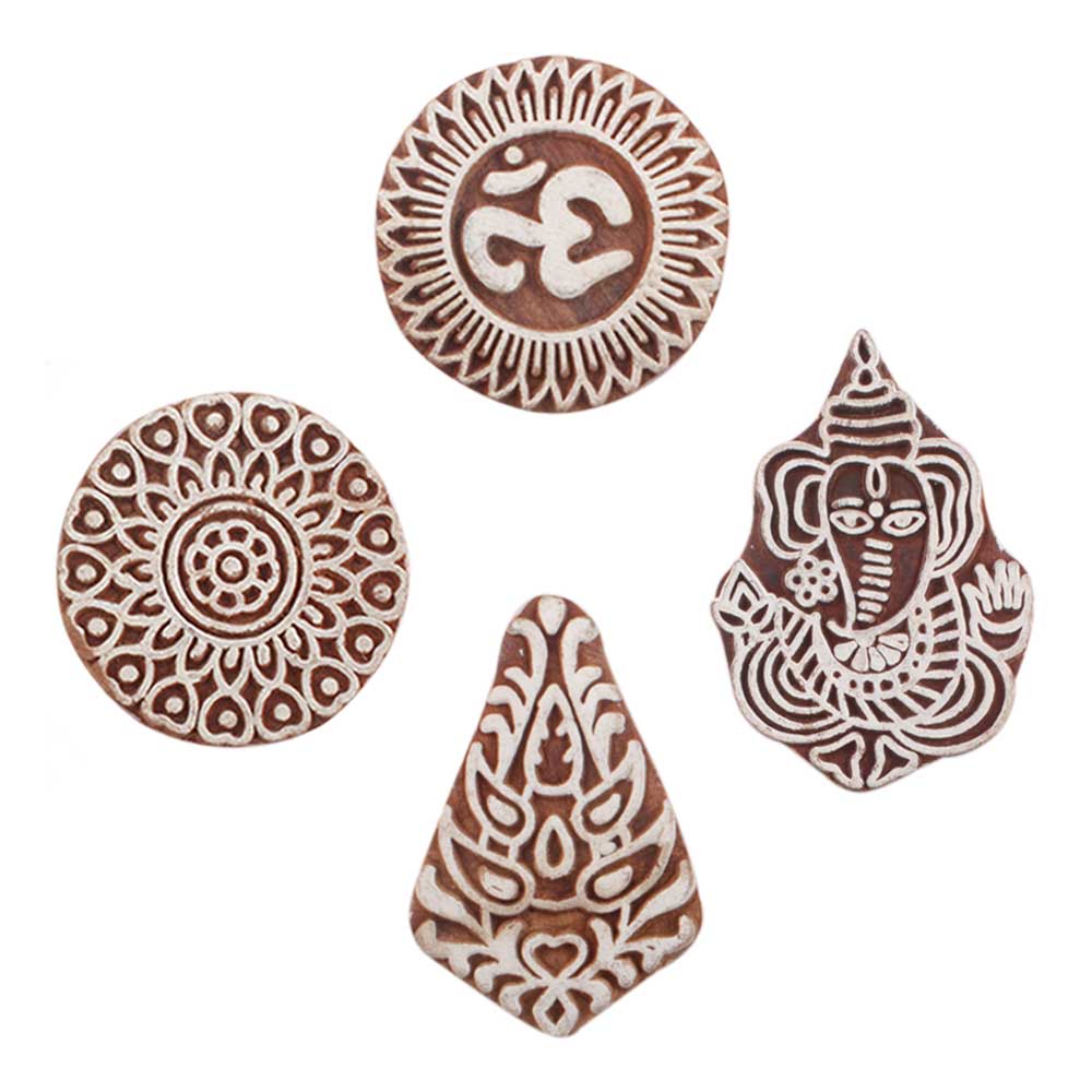 Set of 4 Piece New Mix Wooden Printing Block. Ideal for use on Fabric, Paper, Canvas, etc. These Blocks can be use to Print with Oil Colors, Fabric Colors, Water Colors, Acrylic Colors and Vegetable Colors.