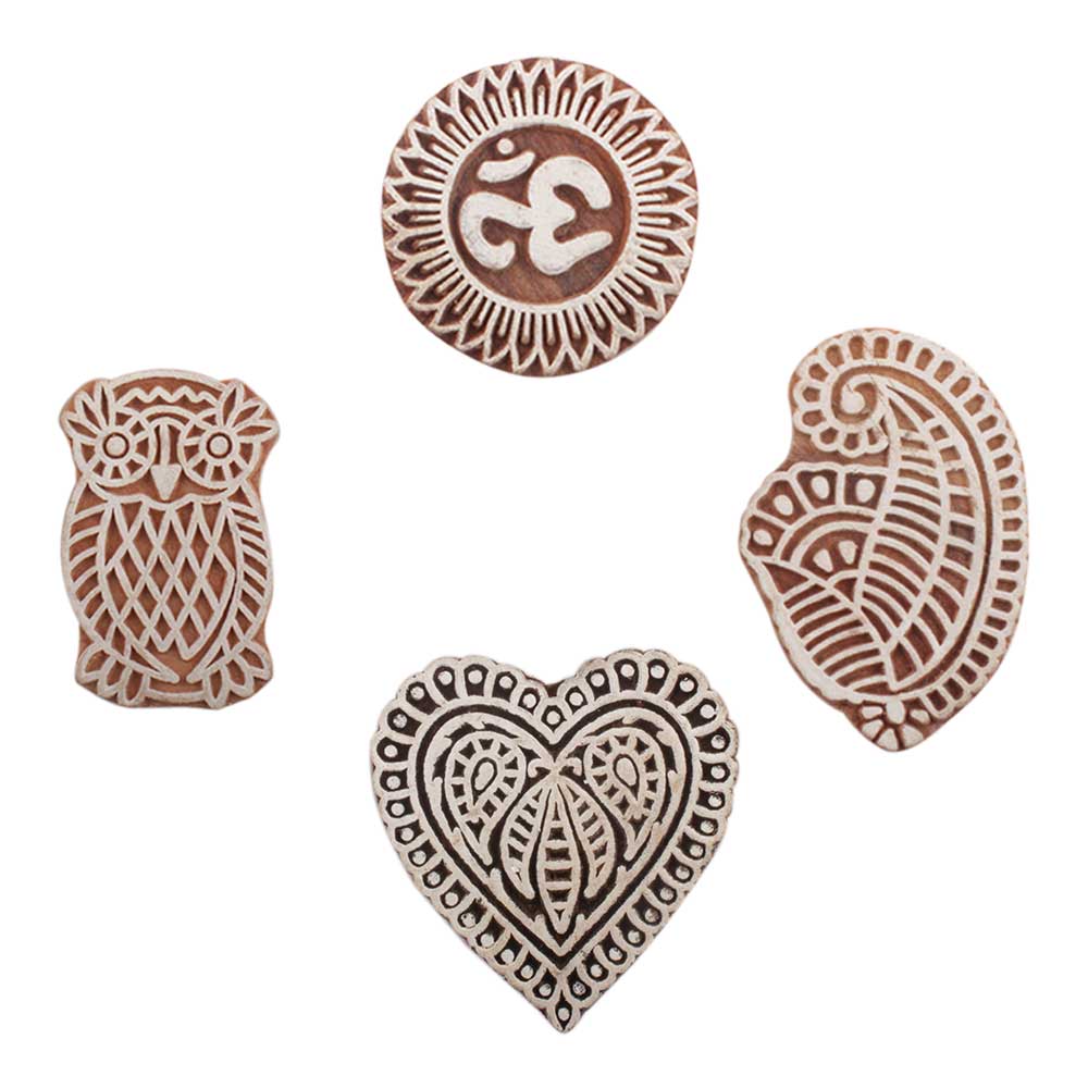 Set of 4 Piece New Mix Wooden Printing Block. Ideal for use on Fabric, Paper, Canvas, etc. These Blocks can be use to Print with Oil Colors, Fabric Colors, Water Colors, Acrylic Colors and Vegetable Colors.