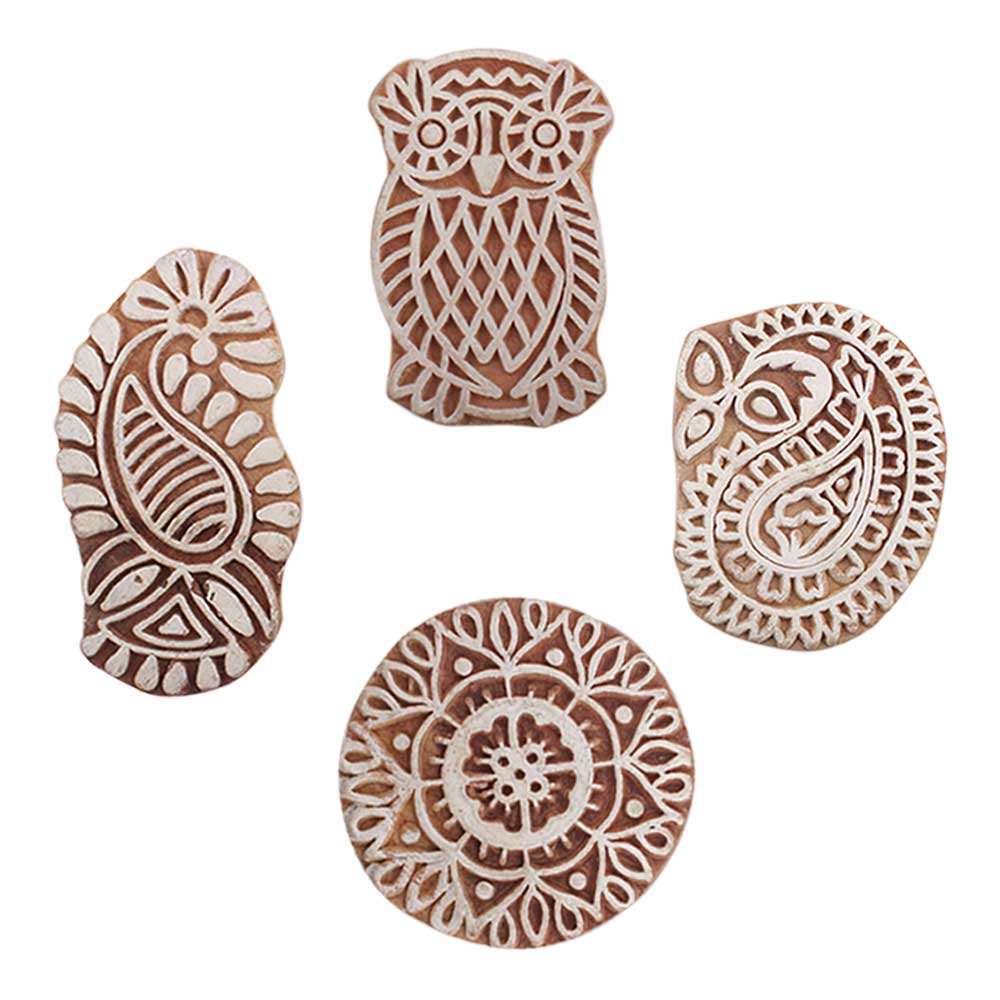 Set of 4 Piece New Mix Wooden Printing Blocks. Ideal for use on Fabric, Paper, Canvas, etc. These Blocks can be use to Print with Oil Colors, Fabric Colors, Water Colors, Acrylic Colors and Vegetable Colors.