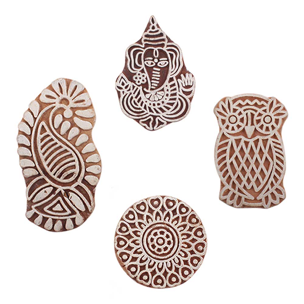 Set of 4 Piece New Mix Wooden Printing Blocks. Ideal for use on Fabric, Paper, Canvas, etc. These Blocks can be use to Print with Oil Colors, Fabric Colors, Water Colors, Acrylic Colors and Vegetable Colors.