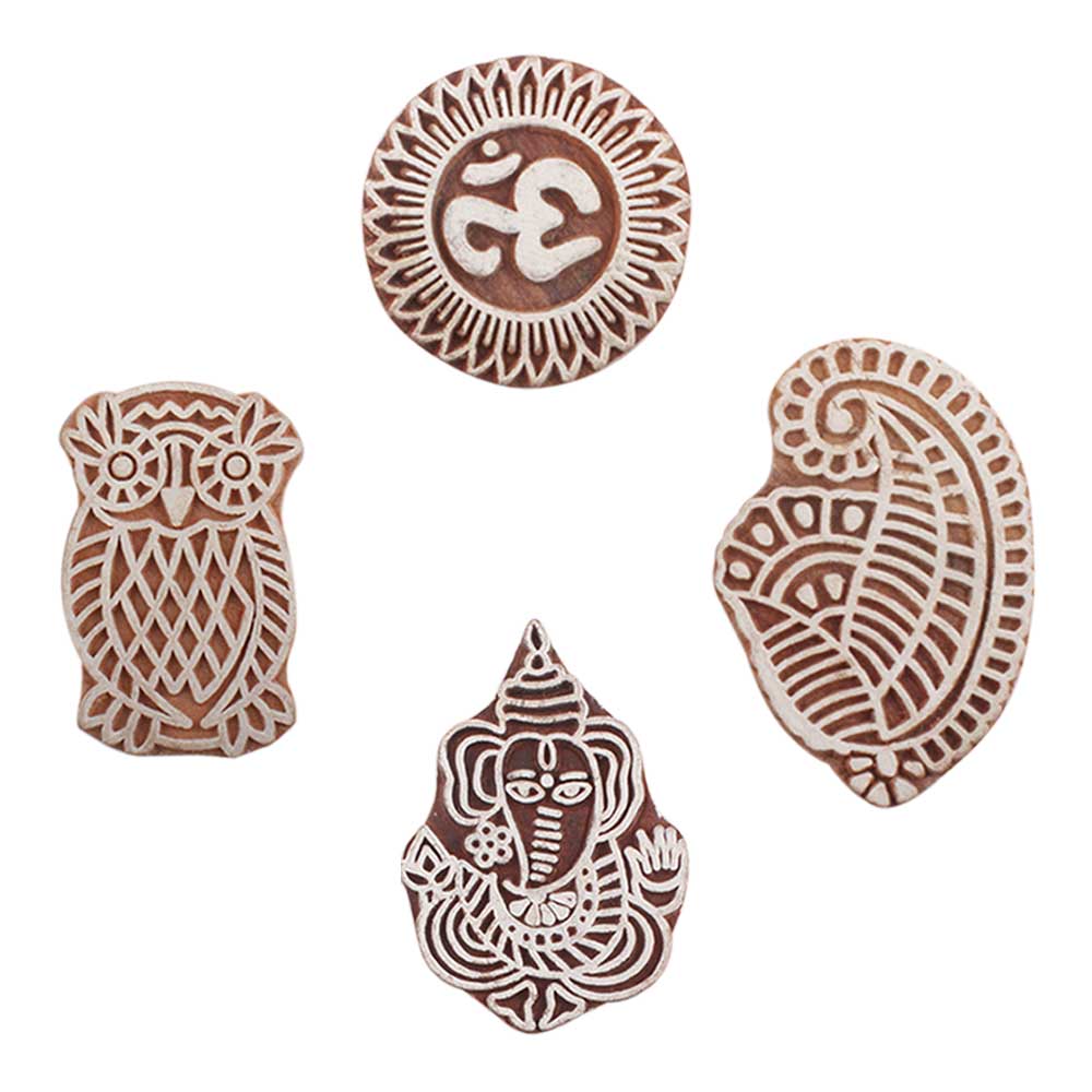 Set of 4 Piece New Mix Wooden Printing Blocks. Ideal for use on Fabric, Paper, Canvas, etc. These Blocks can be use to Print with Oil Colors, Fabric Colors, Water Colors, Acrylic Colors and Vegetable Colors.