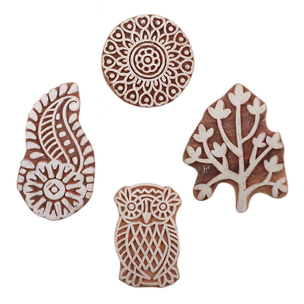 Set of 4 Piece New Mix Wooden Printing Blocks. Ideal for use on Fabric, Paper, Canvas, etc. These Blocks can be use to Print with Oil Colors, Fabric Colors, Water Colors, Acrylic Colors and Vegetable Colors.