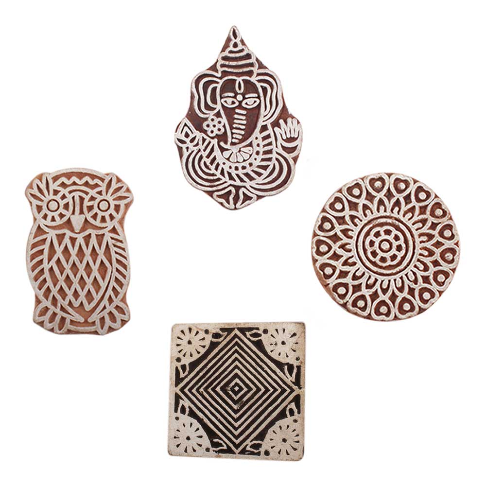 Set of 4 Piece New Mix Wooden Printing Blocks. Ideal for use on Fabric, Paper, Canvas, etc. These Blocks can be use to Print with Oil Colors, Fabric Colors, Water Colors, Acrylic Colors and Vegetable Colors.