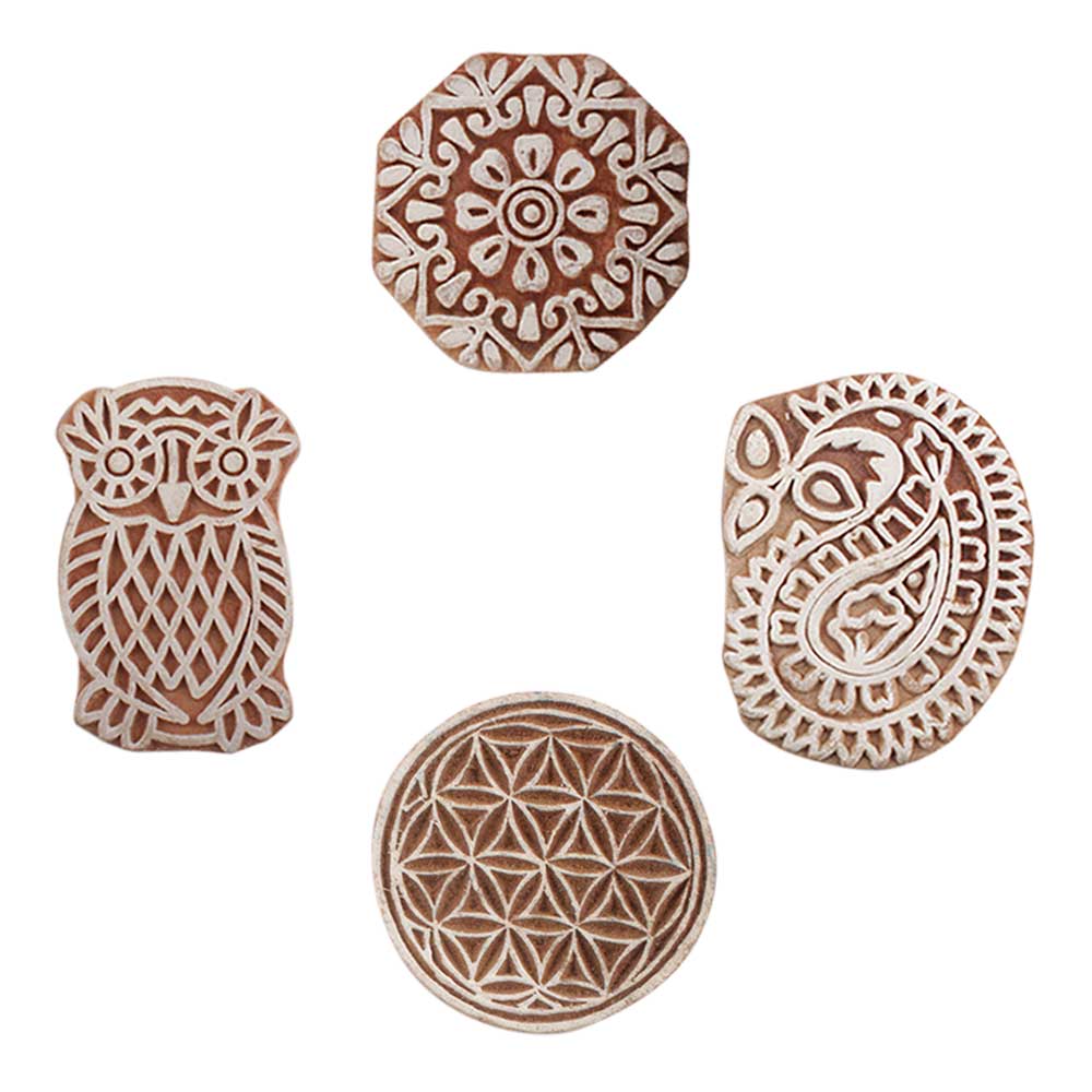 Set of 4 Piece New Mix Wooden Printing Blocks. Ideal for use on Fabric, Paper, Canvas, etc. These Blocks can be use to Print with Oil Colors, Fabric Colors, Water Colors, Acrylic Colors and Vegetable Colors.