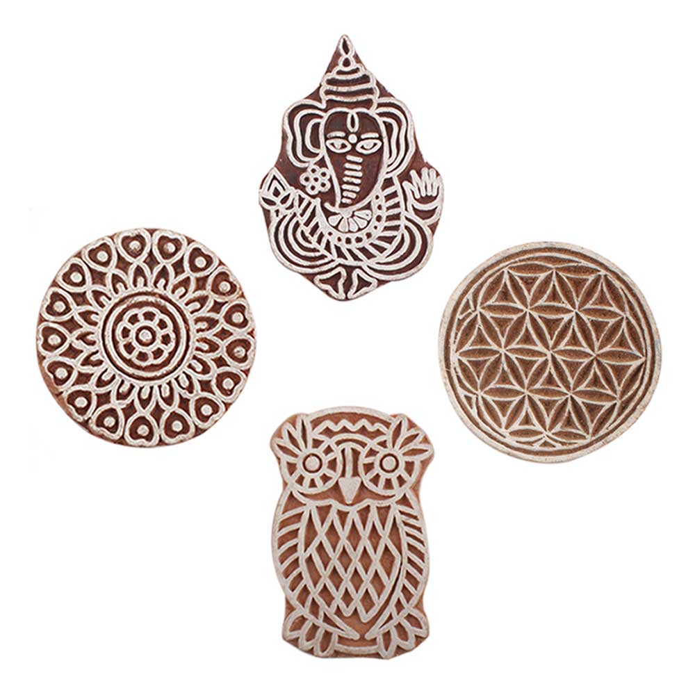 Set of 4 Piece New Mix Wooden Printing Blocks. Ideal for use on Fabric, Paper, Canvas, etc. These Blocks can be use to Print with Oil Colors, Fabric Colors, Water Colors, Acrylic Colors and Vegetable Colors.