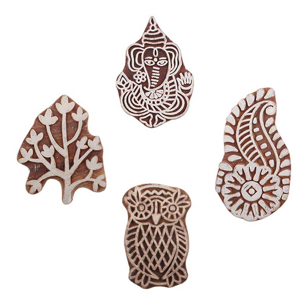 Set of 4 Piece New Mix Wooden Printing Blocks. Ideal for use on Fabric, Paper, Canvas, etc. These Blocks can be use to Print with Oil Colors, Fabric Colors, Water Colors, Acrylic Colors and Vegetable Colors.