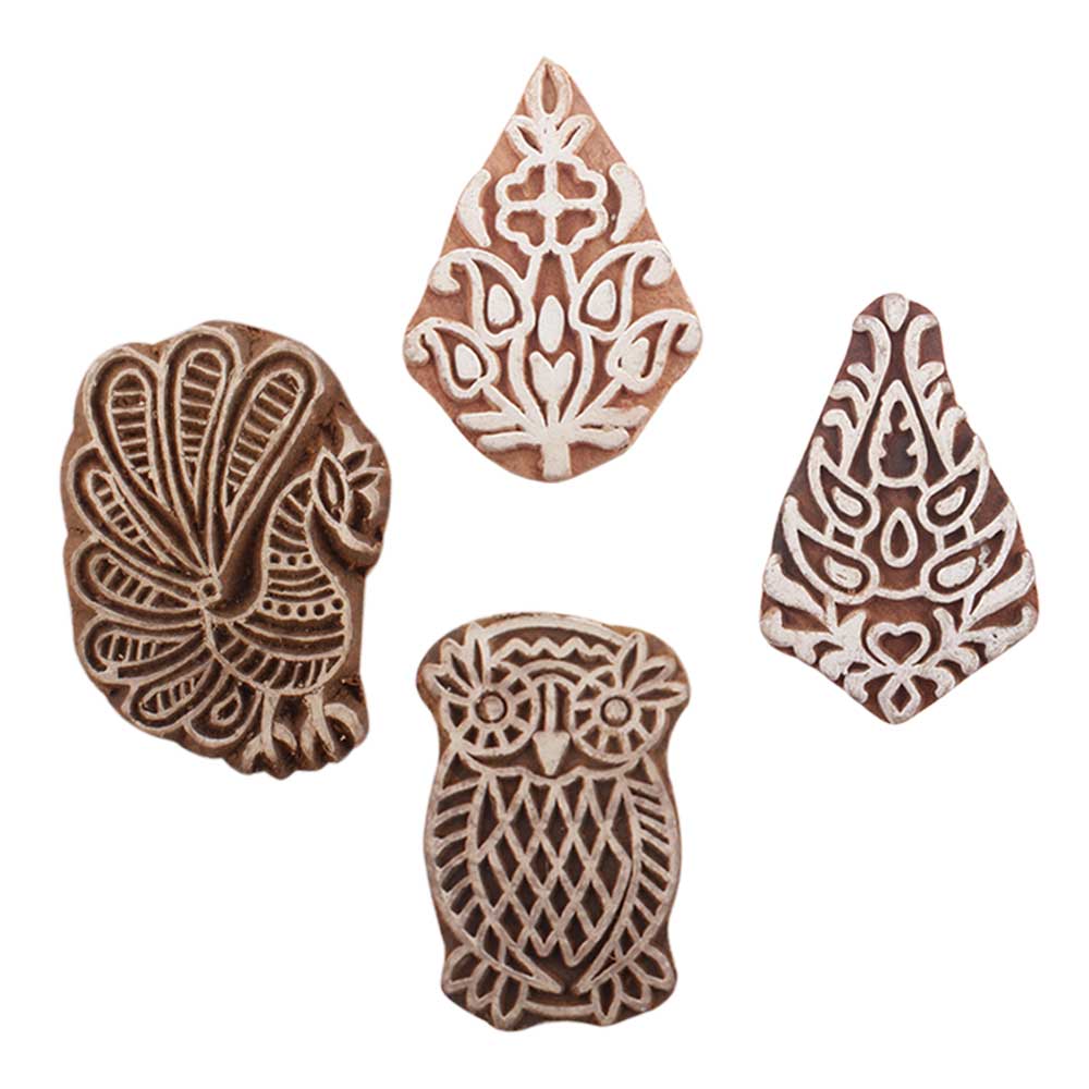 Set of 4 Piece New Mix Wooden Printing Blocks. Ideal for use on Fabric, Paper, Canvas, etc. These Blocks can be use to Print with Oil Colors, Fabric Colors, Water Colors, Acrylic Colors and Vegetable Colors.