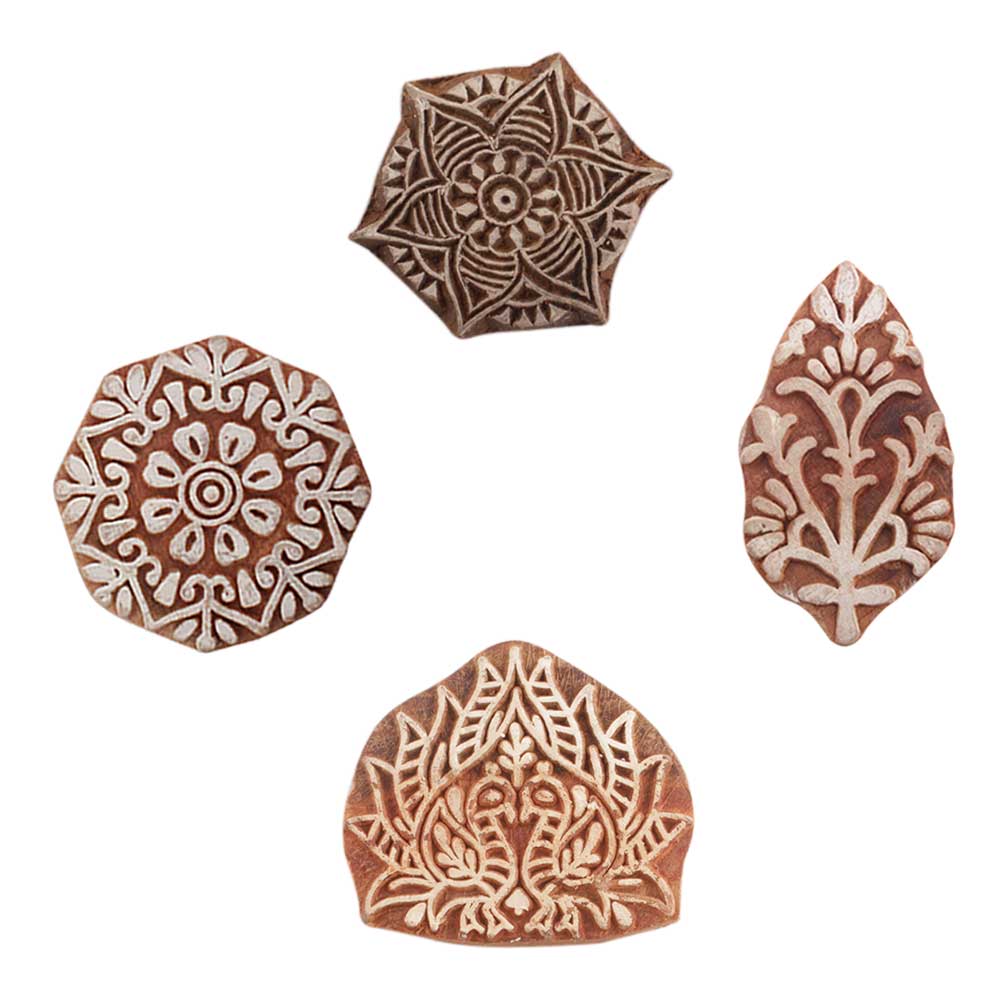 Set of 4 Piece New Mix Wooden Printing Blocks. Ideal for use on Fabric, Paper, Canvas, etc. These Blocks can be use to Print with Oil Colors, Fabric Colors, Water Colors, Acrylic Colors and Vegetable Colors.