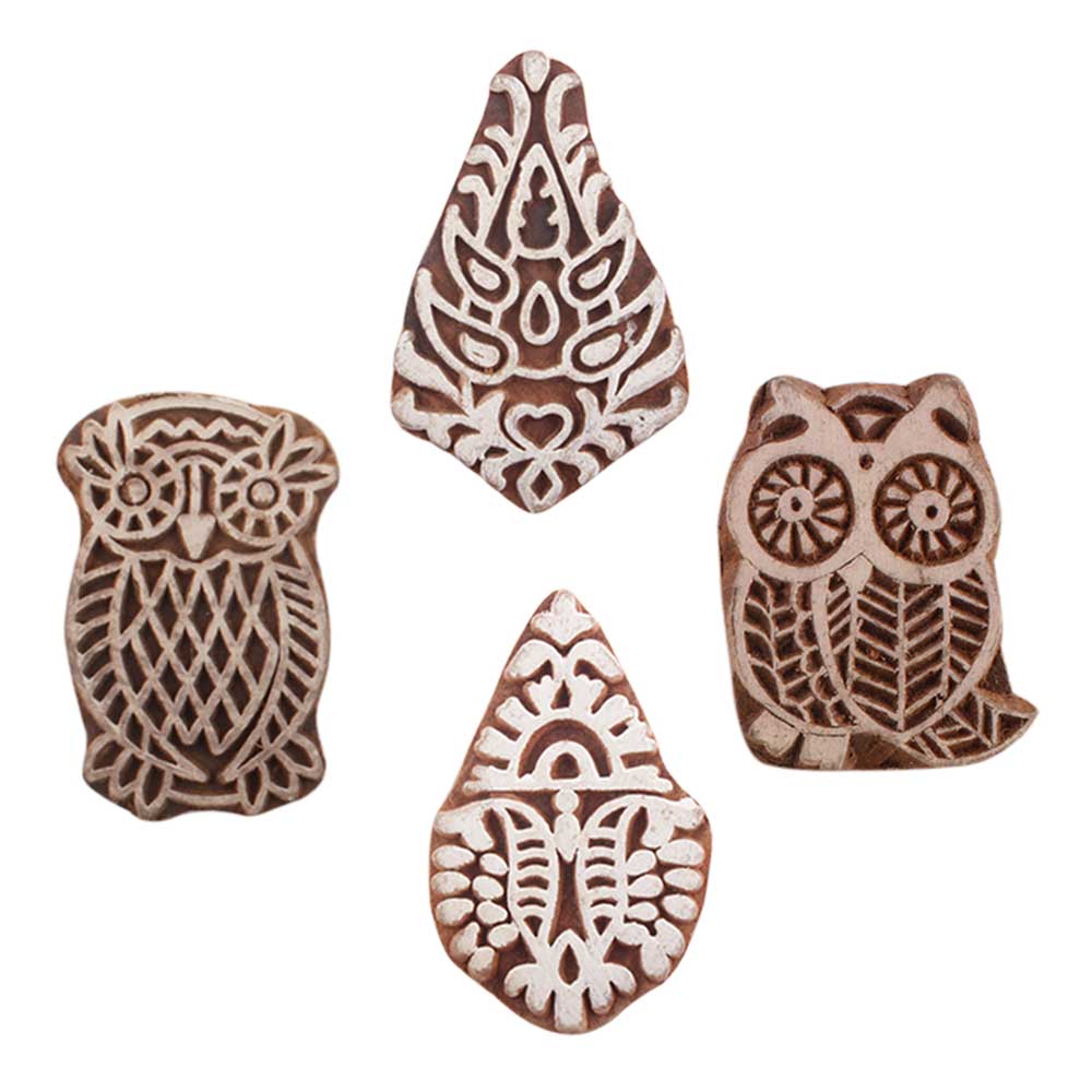 Set of 4 Piece New Mix Wooden Printing Blocks. Ideal for use on Fabric, Paper, Canvas, etc. These Blocks can be use to Print with Oil Colors, Fabric Colors, Water Colors, Acrylic Colors and Vegetable Colors.