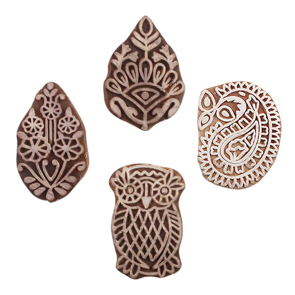 Set of 4 Piece New Mix Wooden Printing Blocks. Ideal for use on Fabric, Paper, Canvas, etc. These Blocks can be use to Print with Oil Colors, Fabric Colors, Water Colors, Acrylic Colors and Vegetable Colors.