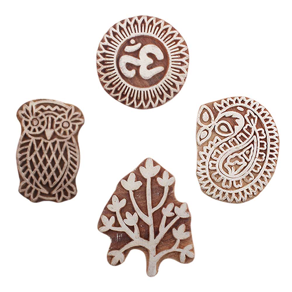 Set of 4 Piece New Mix Wooden Printing Blocks. Ideal for use on Fabric, Paper, Canvas, etc. These Blocks can be use to Print with Oil Colors, Fabric Colors, Water Colors, Acrylic Colors and Vegetable Colors.