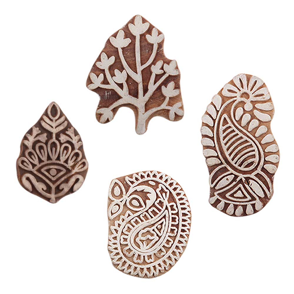 Set of 4 Piece New Mix Wooden Printing Blocks. Ideal for use on Fabric, Paper, Canvas, etc. These Blocks can be use to Print with Oil Colors, Fabric Colors, Water Colors, Acrylic Colors and Vegetable Colors.