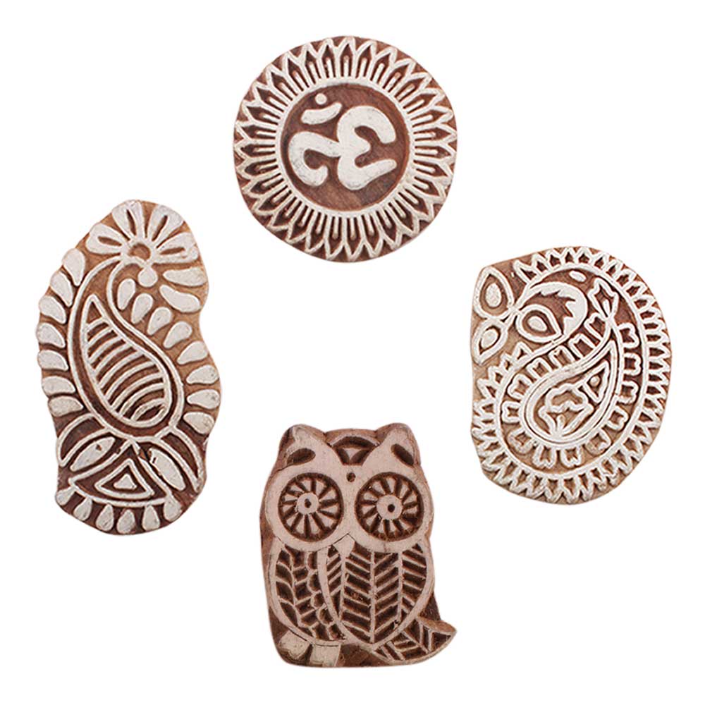 Set of 4 Piece New Mix Wooden Printing Blocks. Ideal for use on Fabric, Paper, Canvas, etc. These Blocks can be use to Print with Oil Colors, Fabric Colors, Water Colors, Acrylic Colors and Vegetable Colors.