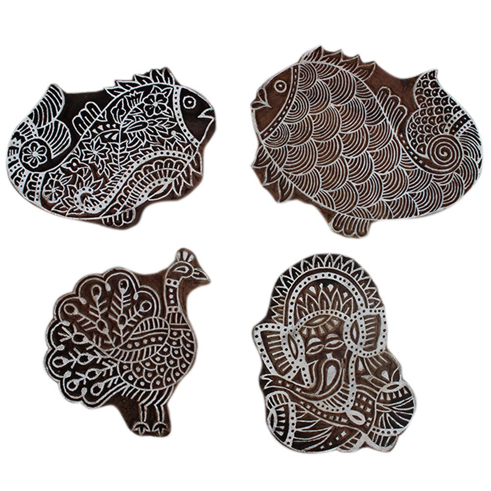 Set of 4 Piece New Wooden Printing Block. Ideal for Using on Fabric, Paper, Canvas, etc. These Blocks can be use to Print with Oil Colors, Fabric Colors, Water Colors, Acrylic Colors and Vegetable Colors.