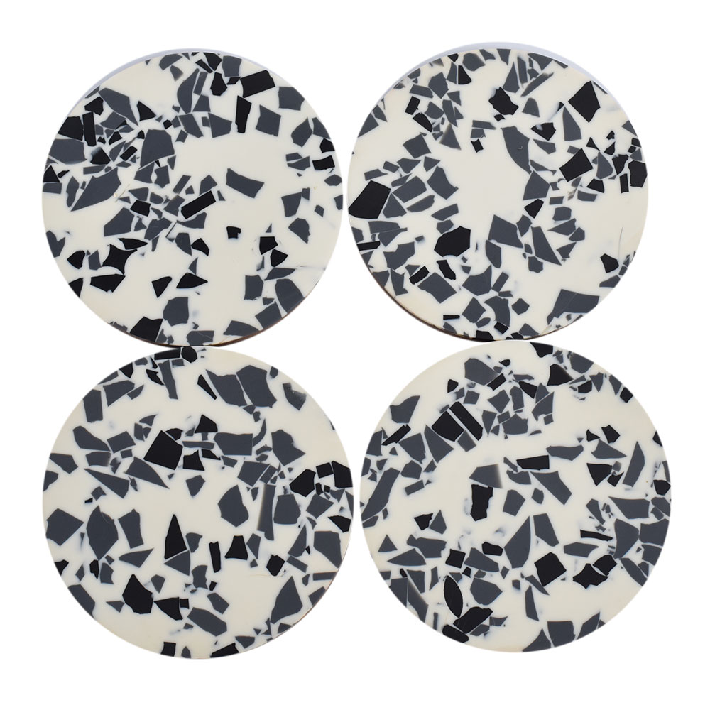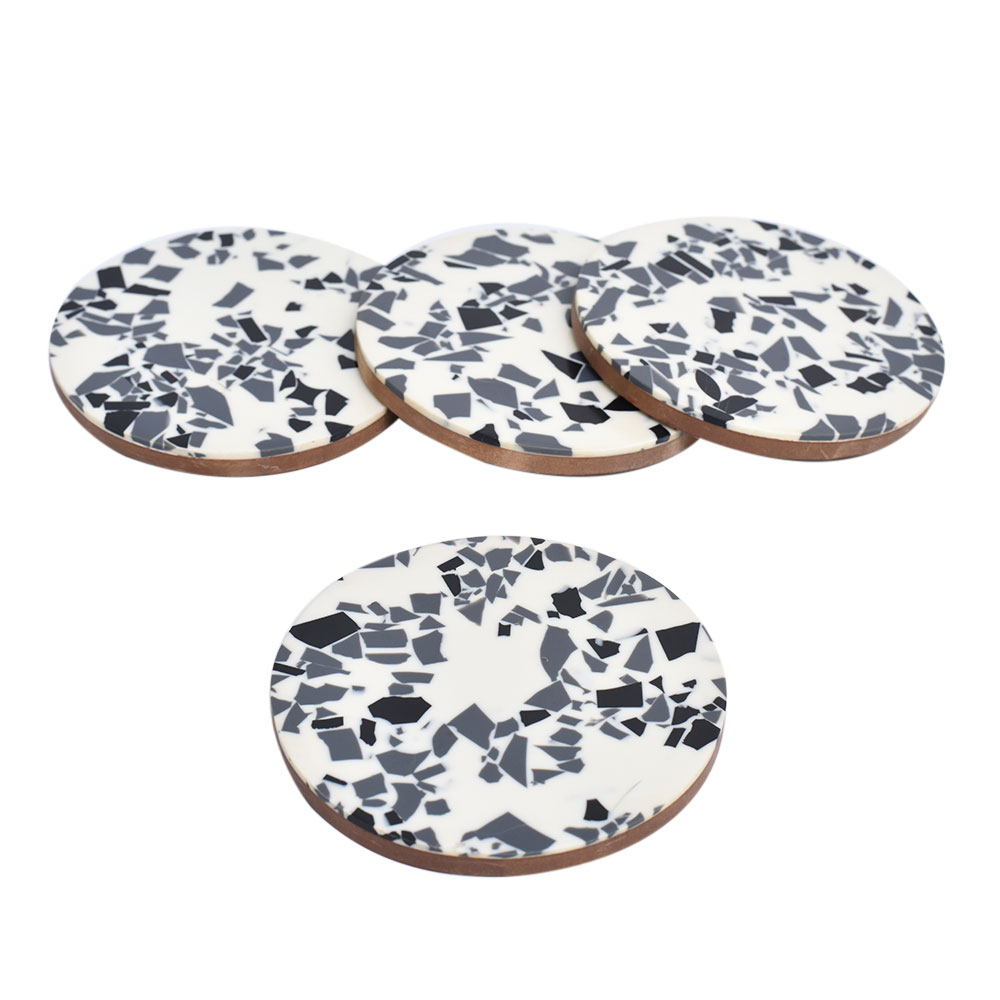 Terrazzo Pattern in Two Tone t his four-piece coaster set is an ideal housewarming, birthday, or wedding gift, and it's also great for decorating your kitchen, living room, bedroom, bar decorations, or office, among other places. Personalized absorbent resin and wood coasters help capture moisture from ice cold drinks and protect tabletops; they can also be given as Housewarming, Thanksgiving, Christmas, New Year, and Birthday gifts for friends, men, women, fathers, mothers, and grandmothers.