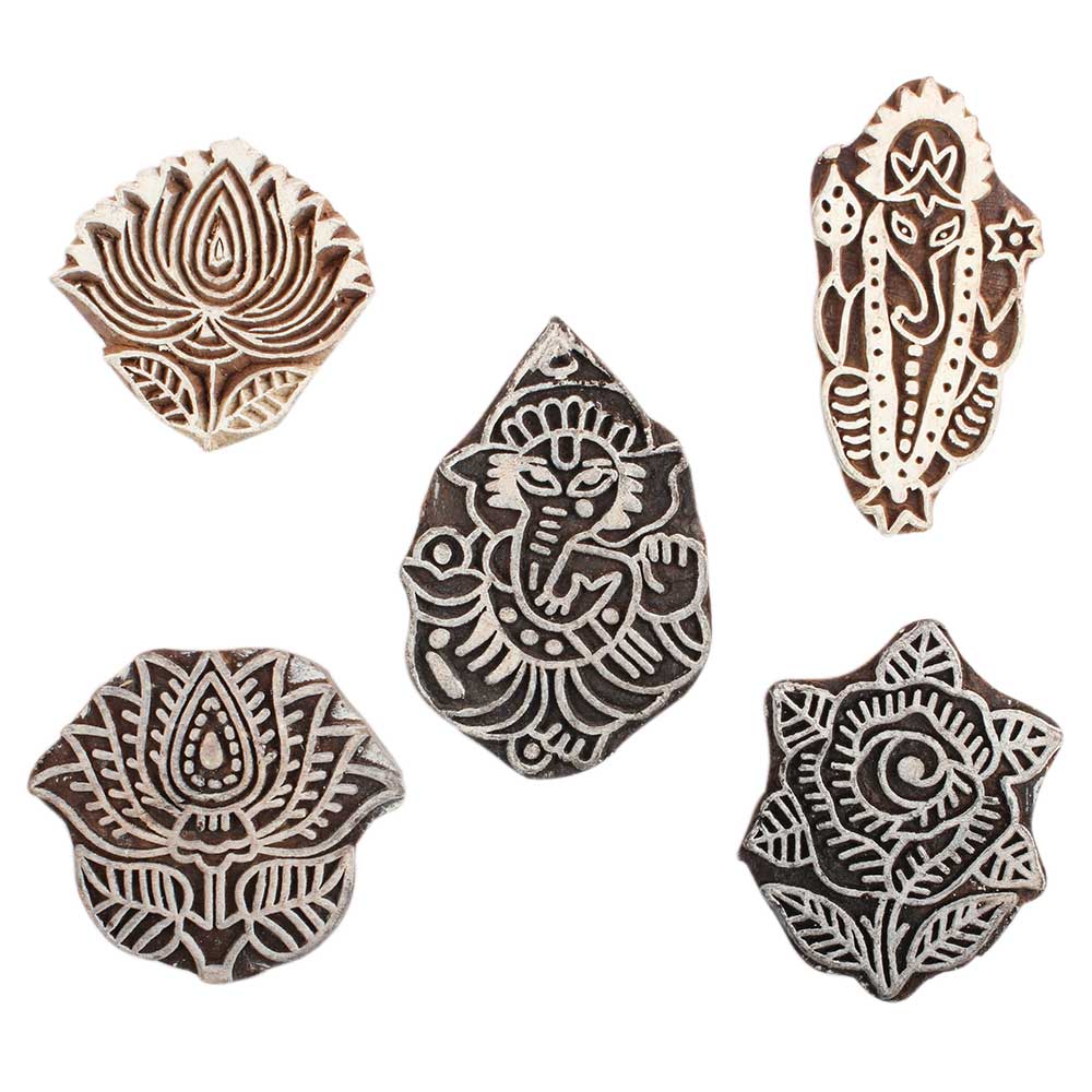 Set of 5 Piece New Mix Wooden Printing Block. Ideal for Using on Fabric, Paper, Canvas, etc. These Blocks can be use to Print with Oil Colors, Fabric Colors, Water Colors, Acrylic Colors and Vegetable Colors.