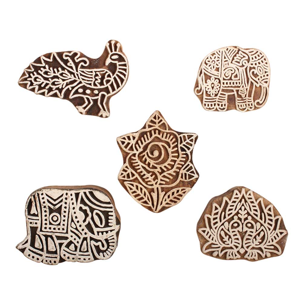 Set of 5 Piece New Mix Wooden Printing Block. Ideal for use on Fabric, Paper, Canvas, etc. These Blocks can be use to Print with Oil Colors, Fabric Colors, Water Colors, Acrylic Colors and Vegetable Colors.