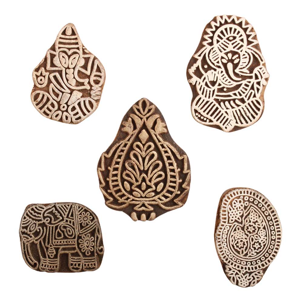 Set of 5 Piece New Mix Wooden Printing Block. Ideal for use on Fabric, Paper, Canvas, etc. These Blocks can be use to Print with Oil Colors, Fabric Colors, Water Colors, Acrylic Colors and Vegetable Colors.