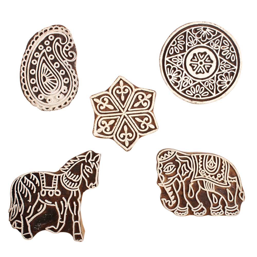 Set of 5 Piece New Mix Wooden Printing Block. Ideal for use on Fabric, Paper, Canvas, etc. These Blocks can be use to Print with Oil Colors, Fabric Colors, Water Colors, Acrylic Colors and Vegetable Colors.