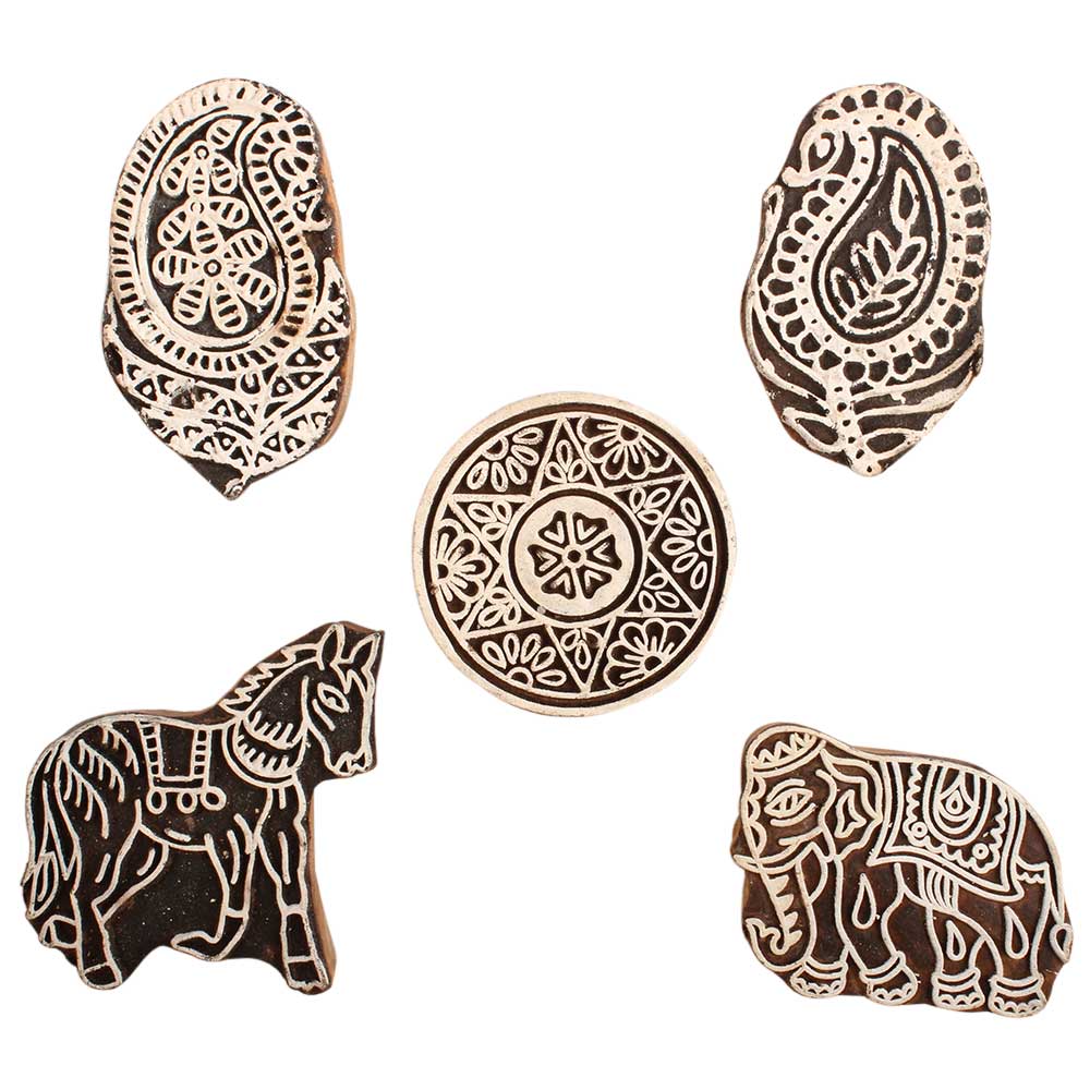 Set of 5 Piece New Mix Wooden Printing Block. Ideal for use on Fabric, Paper, Canvas, etc. These Blocks can be use to Print with Oil Colors, Fabric Colors, Water Colors, Acrylic Colors and Vegetable Colors.