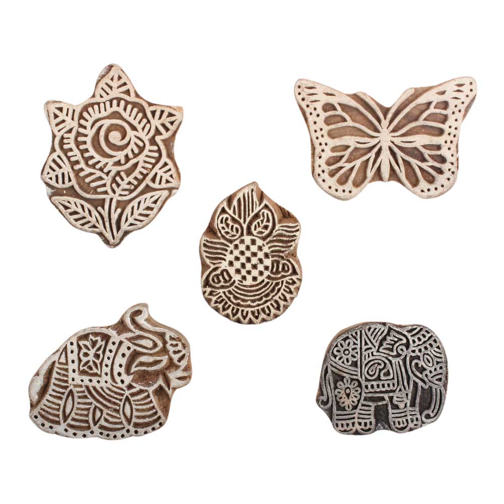 Set of 5 Piece New Mix Wooden Printing Block. Ideal for use on Fabric, Paper, Canvas, etc. These Blocks can be use to Print with Oil Colors, Fabric Colors, Water Colors, Acrylic Colors and Vegetable Colors.