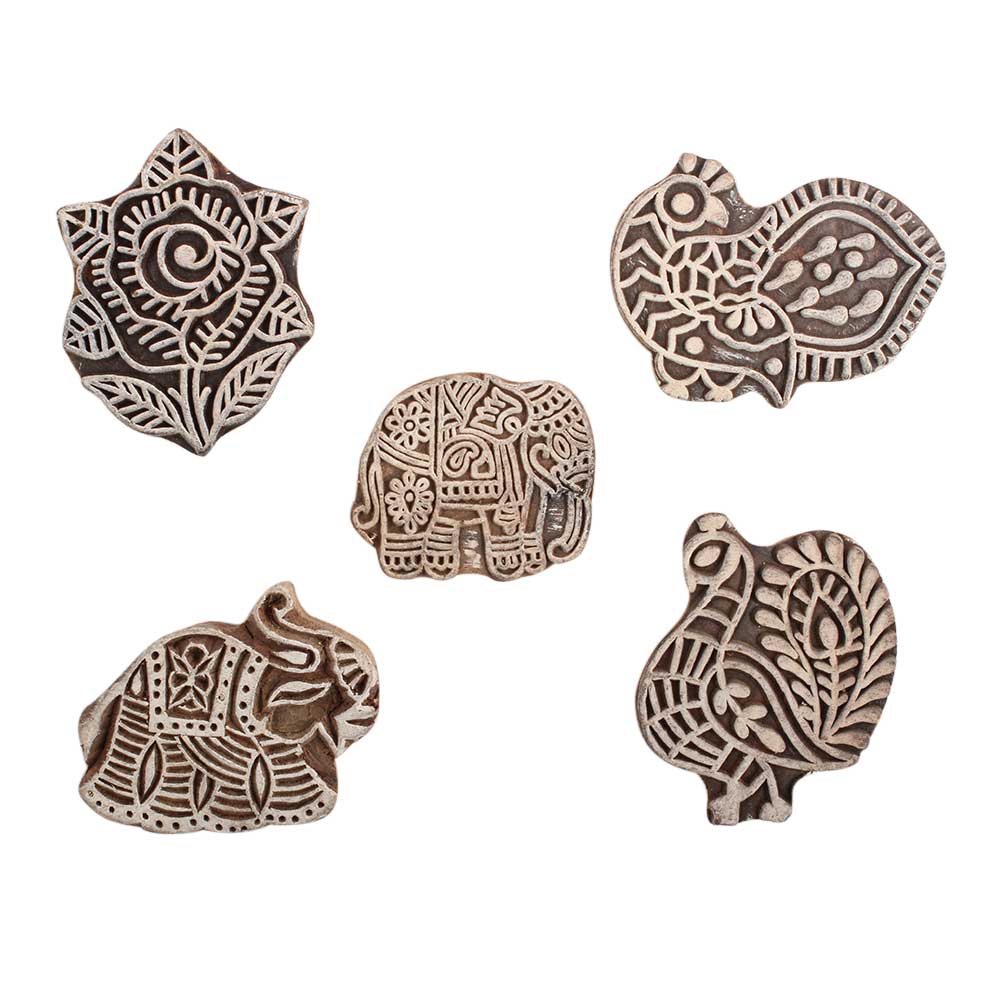 Set of 5 Piece New Mix Wooden Printing Block. Ideal for use on Fabric, Paper, Canvas, etc. These Blocks can be use to Print with Oil Colors, Fabric Colors, Water Colors, Acrylic Colors and Vegetable Colors.