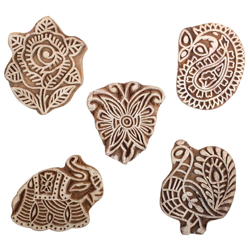 Set of 5 Piece New Mix Wooden Printing Block. Ideal for use on Fabric, Paper, Canvas, etc. These Blocks can be use to Print with Oil Colors, Fabric Colors, Water Colors, Acrylic Colors and Vegetable Colors.