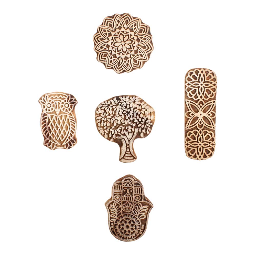 Set of 5 Piece New Mix Wooden Printing Block. Ideal for use on Fabric, Paper, Canvas, etc. These Blocks can be use to Print with Oil Colors, Fabric Colors, Water Colors, Acrylic Colors and Vegetable Colors.
