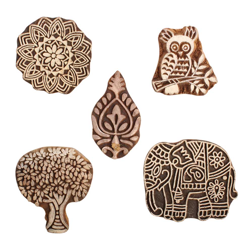 Set of 5 Piece New Mix Wooden Printing Block. Ideal for use on Fabric, Paper, Canvas, etc. These Blocks can be use to Print with Oil Colors, Fabric Colors, Water Colors, Acrylic Colors and Vegetable Colors.