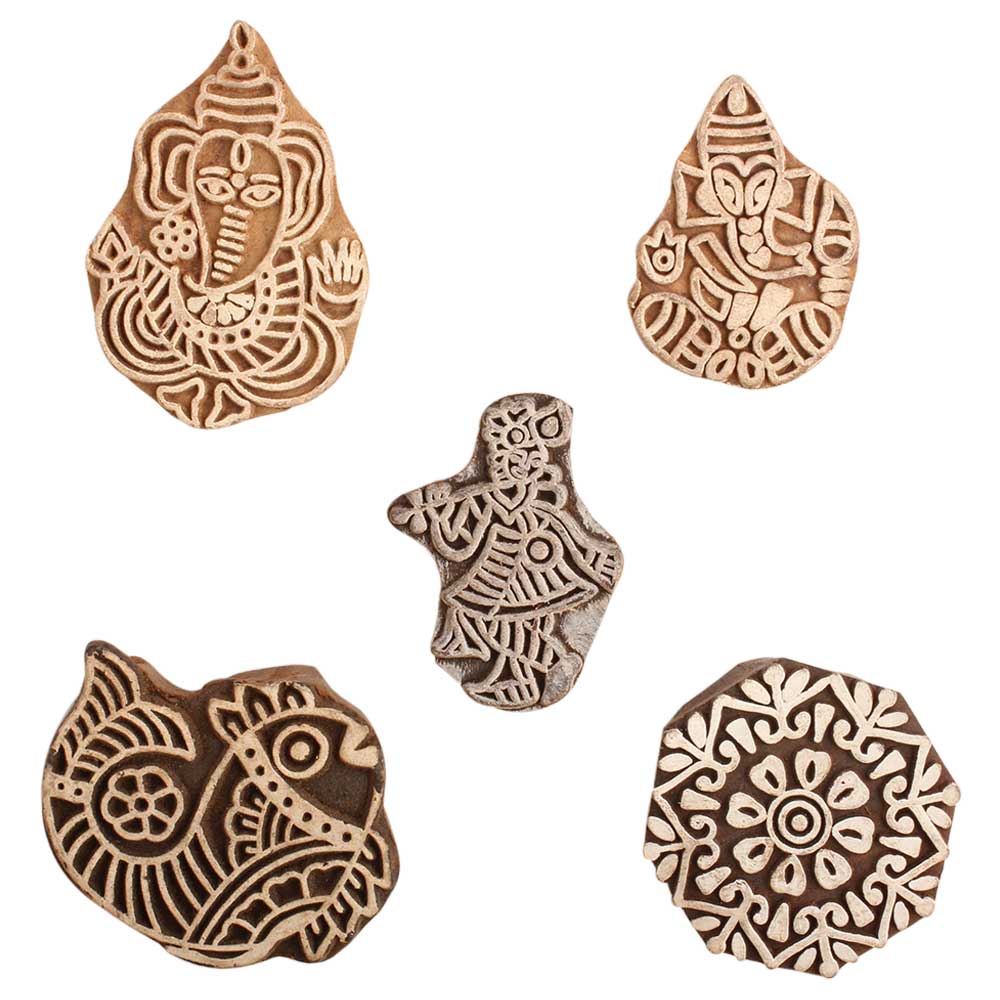 Set of 5 Piece New Mix Wooden Printing Block. Ideal for use on Fabric, Paper, Canvas, etc. These Blocks can be use to Print with Oil Colors, Fabric Colors, Water Colors, Acrylic Colors and Vegetable Colors.