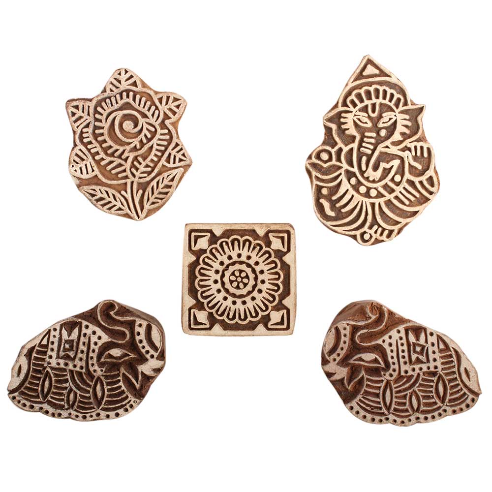 Set of 5 Piece New Mix Wooden Printing Block. Ideal for use on Fabric, Paper, Canvas, etc. These Blocks can be use to Print with Oil Colors, Fabric Colors, Water Colors, Acrylic Colors and Vegetable Colors.