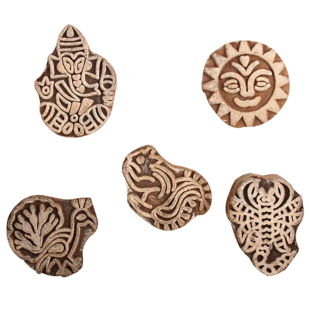 Set of 5 Piece New Mix Wooden Printing Block. Ideal for use on Fabric, Paper, Canvas, etc. These Blocks can be use to Print with Oil Colors, Fabric Colors, Water Colors, Acrylic Colors and Vegetable Colors.