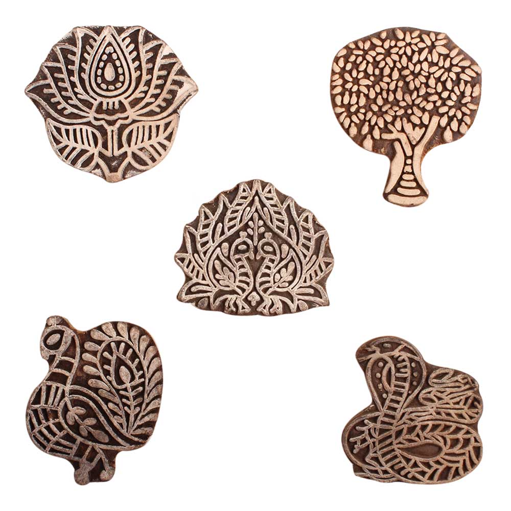 Set of 5 Piece New Mix Wooden Printing Block. Ideal for use on Fabric, Paper, Canvas, etc. These Blocks can be use to Print with Oil Colors, Fabric Colors, Water Colors, Acrylic Colors and Vegetable Colors.