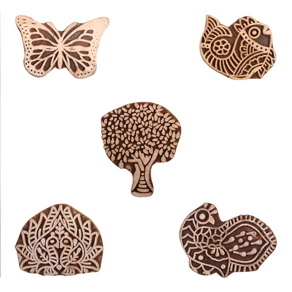 Set of 5 Piece New Mix Wooden Printing Block. Ideal for use on Fabric, Paper, Canvas, etc. These Blocks can be use to Print with Oil Colors, Fabric Colors, Water Colors, Acrylic Colors and Vegetable Colors.
