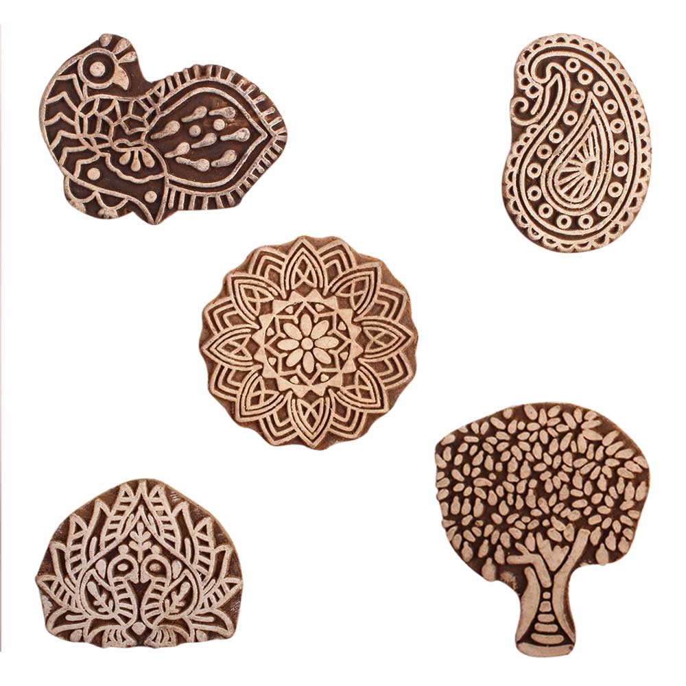 Set of 5 Piece New Mix Wooden Printing Block. Ideal for use on Fabric, Paper, Canvas, etc. These Blocks can be use to Print with Oil Colors, Fabric Colors, Water Colors, Acrylic Colors and Vegetable Colors.