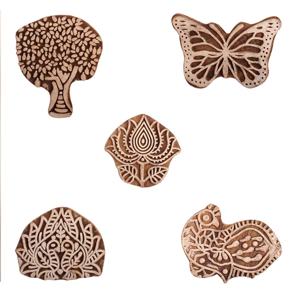 Set of 5 Piece New Mix Wooden Printing Block. Ideal for use on Fabric, Paper, Canvas, etc. These Blocks can be use to Print with Oil Colors, Fabric Colors, Water Colors, Acrylic Colors and Vegetable Colors.