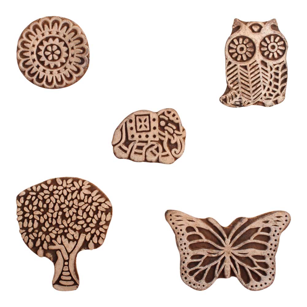 Set of 5 Piece New Mix Wooden Printing Block. Ideal for use on Fabric, Paper, Canvas, etc. These Blocks can be use to Print with Oil Colors, Fabric Colors, Water Colors, Acrylic Colors and Vegetable Colors.