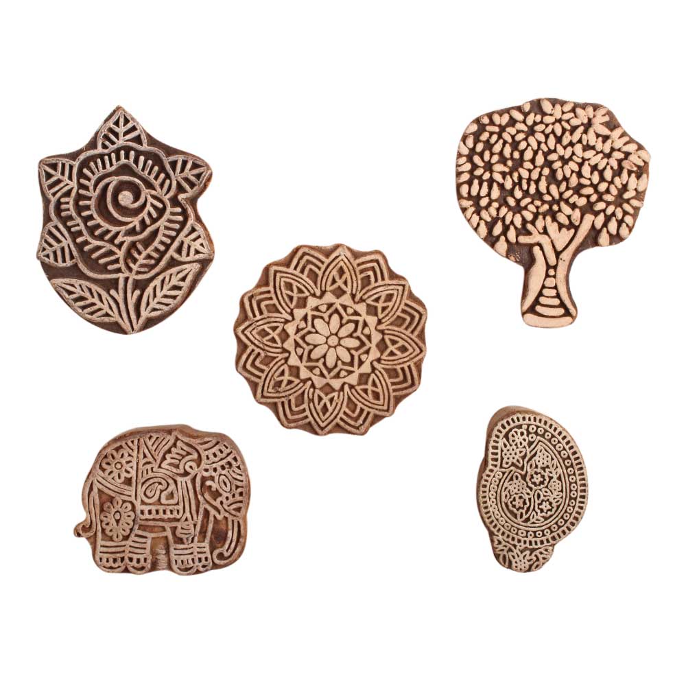 Set of 5 Piece New Mix Wooden Printing Block. Ideal for use on Fabric, Paper, Canvas, etc. These Blocks can be use to Print with Oil Colors, Fabric Colors, Water Colors, Acrylic Colors and Vegetable Colors.