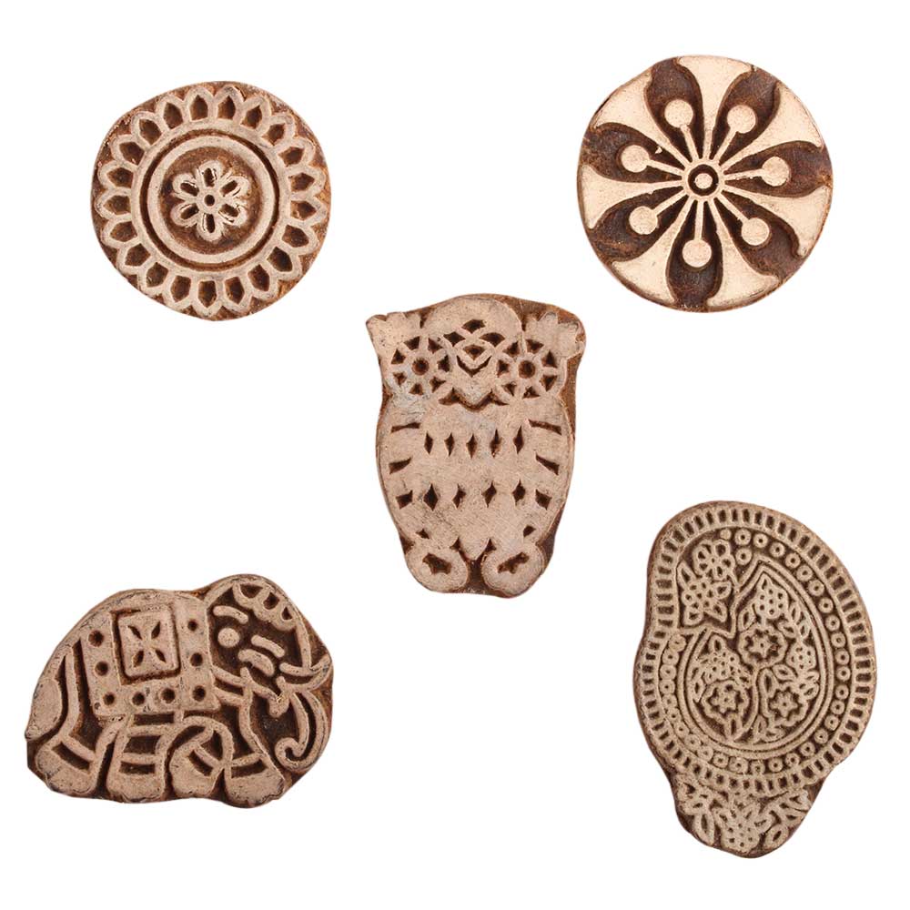 Set of 5 Piece New Mix Wooden Printing Block. Ideal for use on Fabric, Paper, Canvas, etc. These Blocks can be use to Print with Oil Colors, Fabric Colors, Water Colors, Acrylic Colors and Vegetable Colors.
