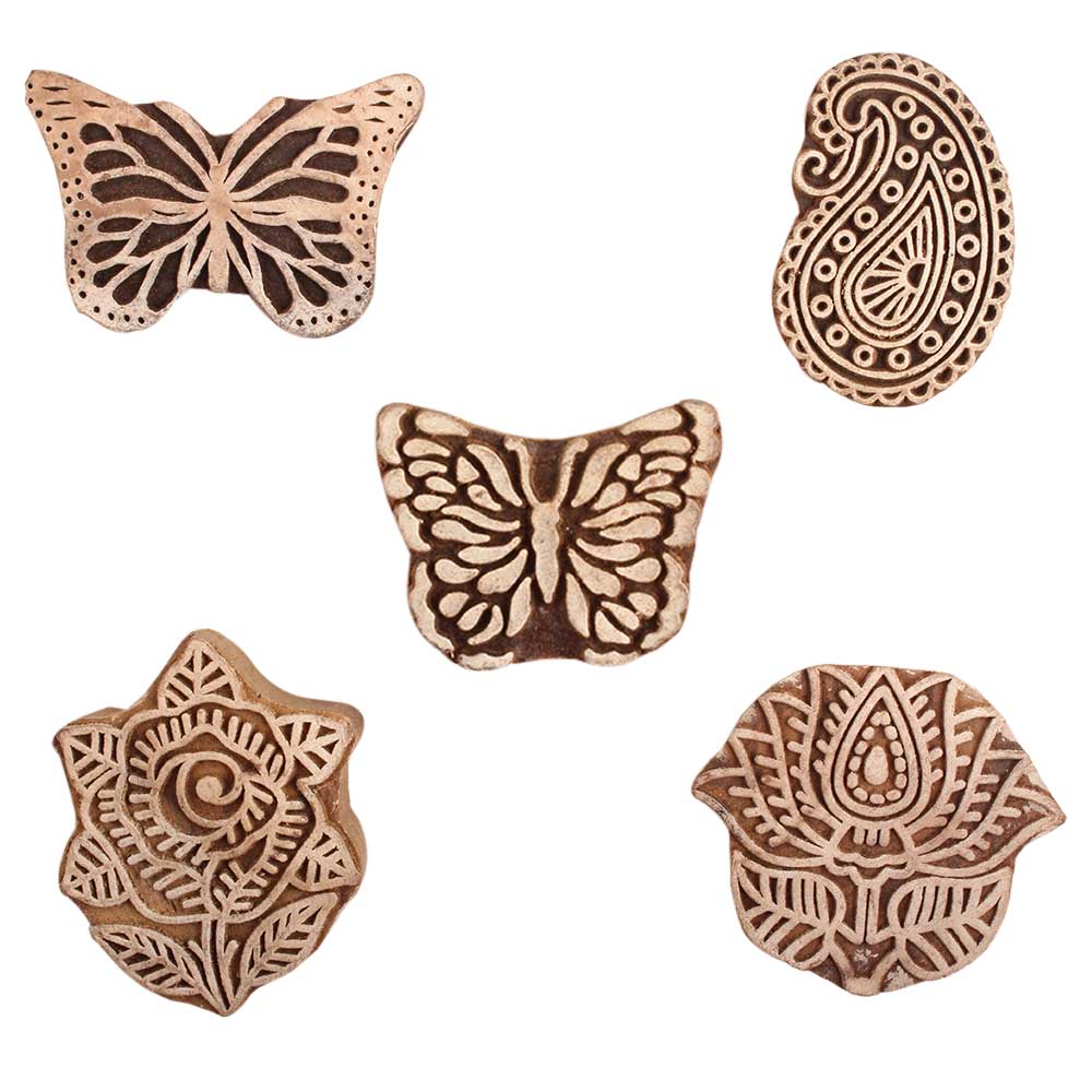 Set of 5 Piece New Mix Wooden Printing Block. Ideal for use on Fabric, Paper, Canvas, etc. These Blocks can be use to Print with Oil Colors, Fabric Colors, Water Colors, Acrylic Colors and Vegetable Colors.