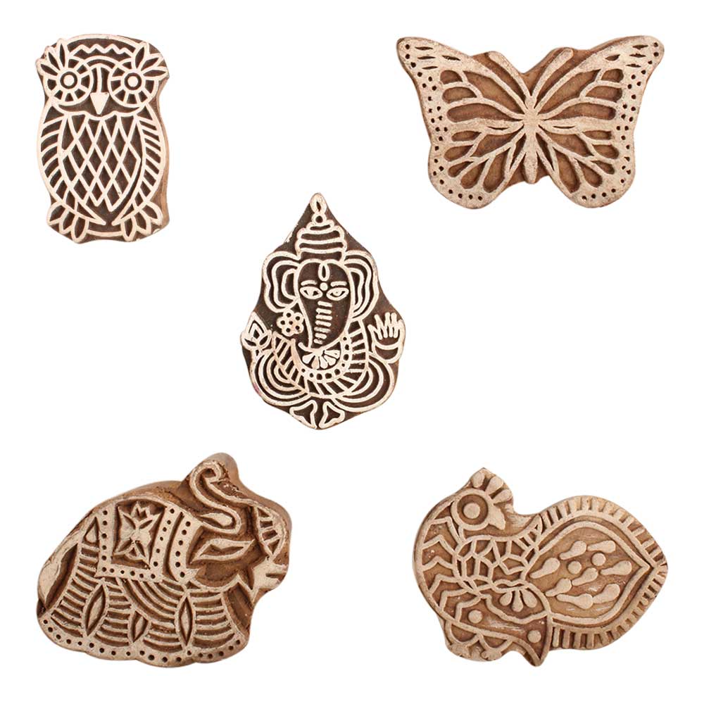 Set of 5 Piece New Mix Wooden Printing Block. Ideal for use on Fabric, Paper, Canvas, etc. These Blocks can be use to Print with Oil Colors, Fabric Colors, Water Colors, Acrylic Colors and Vegetable Colors.